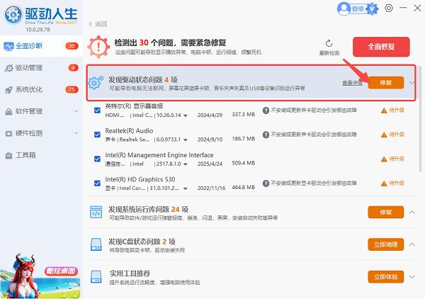3. 扫描完成之后,用户找到驱动部分,点击“待升级”或“修复”即可完成驱动安装。