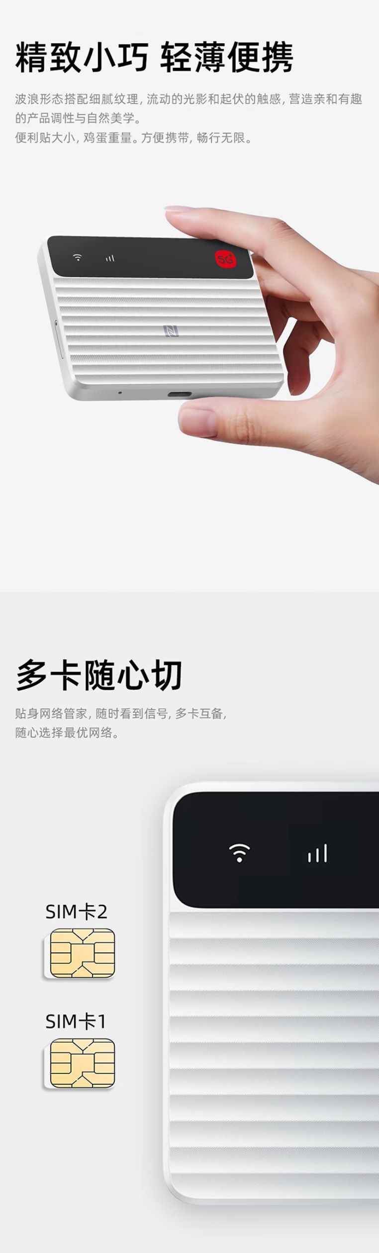 产品搭载 2*mimo 技术,内置 8 根全向天线,支持 sa+nsa 网络环境和 sub-6ghz 频段,匹配中兴官方流量卡(用户也可自行插卡),可供 16 台设备同时连接,网速至高可达 500mbps。