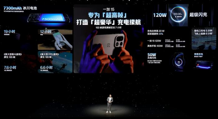 不仅是玩得流畅,还要玩得持久。一加15配备了7300mah超大冰川电池,即使在165超高帧率下玩游戏也能有最多超过7小时的续航时间,如果是刷短视频续航时间更是能达到19小时。并且,一加15还支持120w超级闪充、50w无线闪充,能够更快地为这块大电池充能,碎片化的充电时间就可以换来数小时的续航时长。特别是针对游戏场景,一加15支持行业首发“局间补电”技术,还搭载“旁路供电”功能,避免游戏过程中电量焦虑。