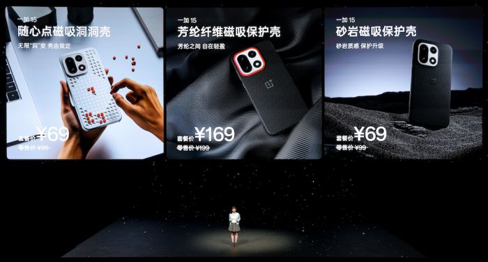 还有一些其他配件:售价299元的一加无限探索双肩包;一加15系列随心点磁吸洞洞壳,售价69元;一加15系列芳纶纤维磁吸保护壳,售价169元;一加15系列砂岩磁吸保护壳,售价69元;150w超能核超级闪充移动电源,售价299元。