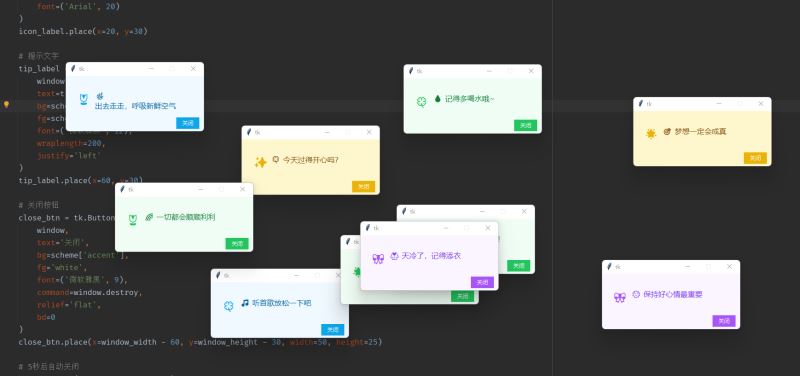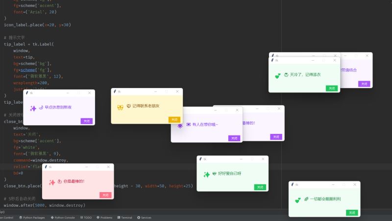 这个小小的python程序展示了如何使用tkinter创建美观实用的桌面应用。它不仅是一个温馨的提醒工具,也是学习python gui编程的好例子。你可以在此基础上继续扩展,比如添加设置界面、数据库支持、网络功能等,打造更加强大的个人助手应用。