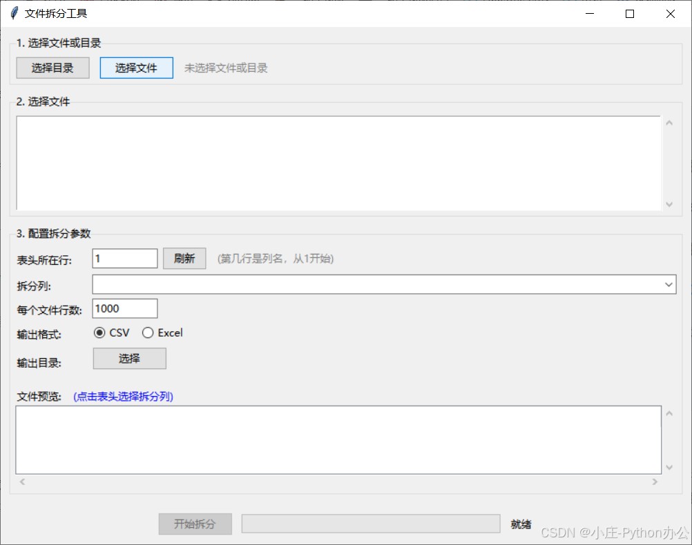 # 响应式布局设计 main_frame.columnconfigure(1, weight=1) main_frame.rowconfigure(2, weight=1) # 分区域功能组织 select_frame = ttk.labelframe(main_frame, text="1. 选择文件或目录") file_frame = ttk.labelframe(main_frame, text="2. 选择文件") config_frame = ttk.labelframe(main_frame, text="3. 配置拆分参数")