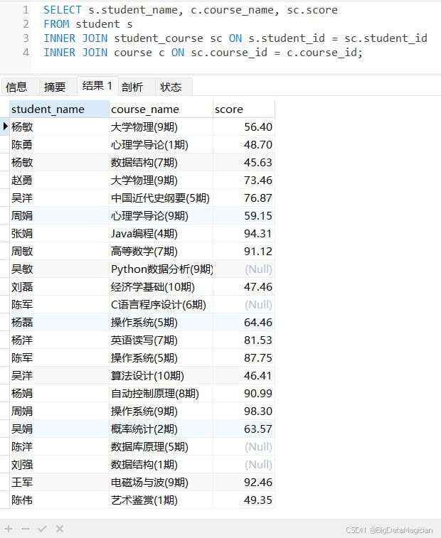 示例1:查询所有学生的选课信息,包括学生姓名、课程名称和成绩