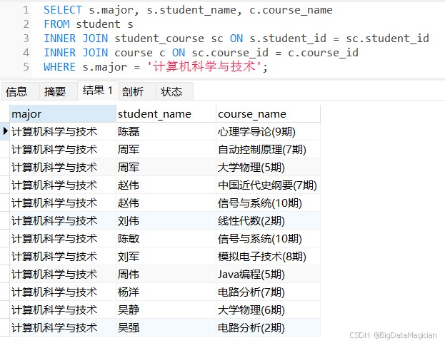 select s.major, s.student_name, c.course_name from student s, student_course sc, course c where s.student_id = sc.student_id and sc.course_id = c.course_id and s.major = '计算机科学与技术';