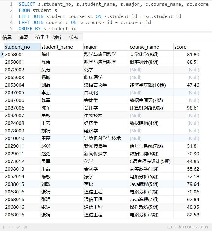 select s.student_no, s.student_name, s.major, c.course_name, sc.score from student s left join student_course sc on s.student_id = sc.student_id left join course c on sc.course_id = c.course_id order by s.student_id;