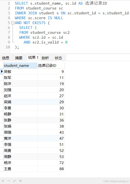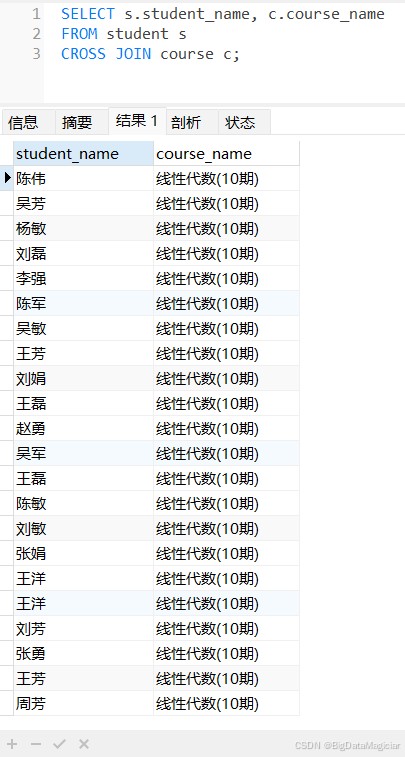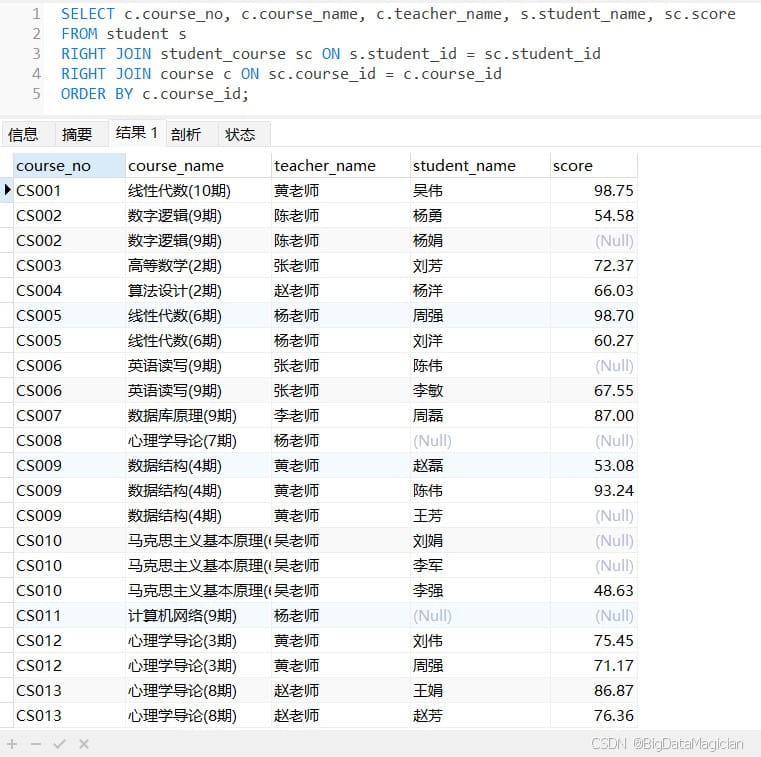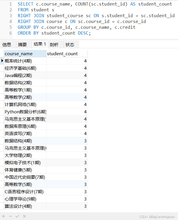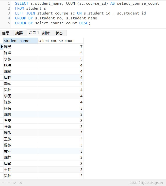 select 'student_course' as table_name, count(*) as count from student_course;二、查询语法及解释