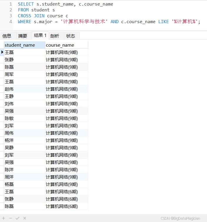 示例2:在特定条件下筛选交叉组合(例如:为“计算机科学与技术”专业的学生匹配所有“计算机类”课程(课程名含“计算机”))。