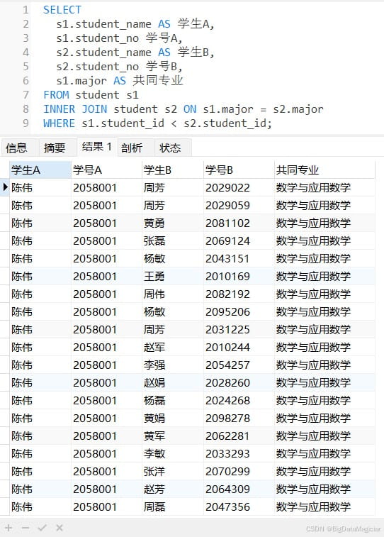 select s1.student_name as 学生a, s1.student_no 学号a, s2.student_name as 学生b, s2.student_no 学号b, s1.major as 共同专业 from student s1, student s2 where s1.major = s2.major and s1.student_id < s2.student_id;
