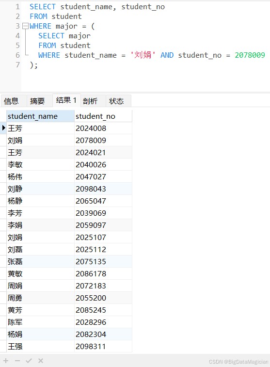 示例1:标量子查询,查询与“刘娟”同专业的所有学生姓名和学号。