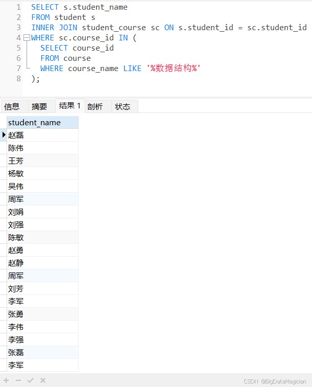 示例2:列子查询,查询“数据结构”课程的所有选课学生姓名。