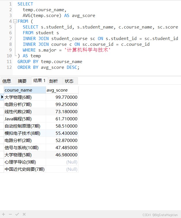 示例3:表子查询,查询“计算机科学与技术”专业学生的平均成绩作为临时表,查询每门课程的平均成绩。