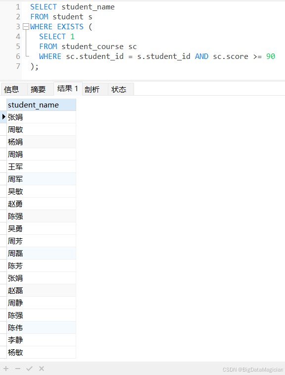 示例4:exists 子查询(判断是否存在记录),查询“至少选了1门课且成绩≥90分”的学生姓名。