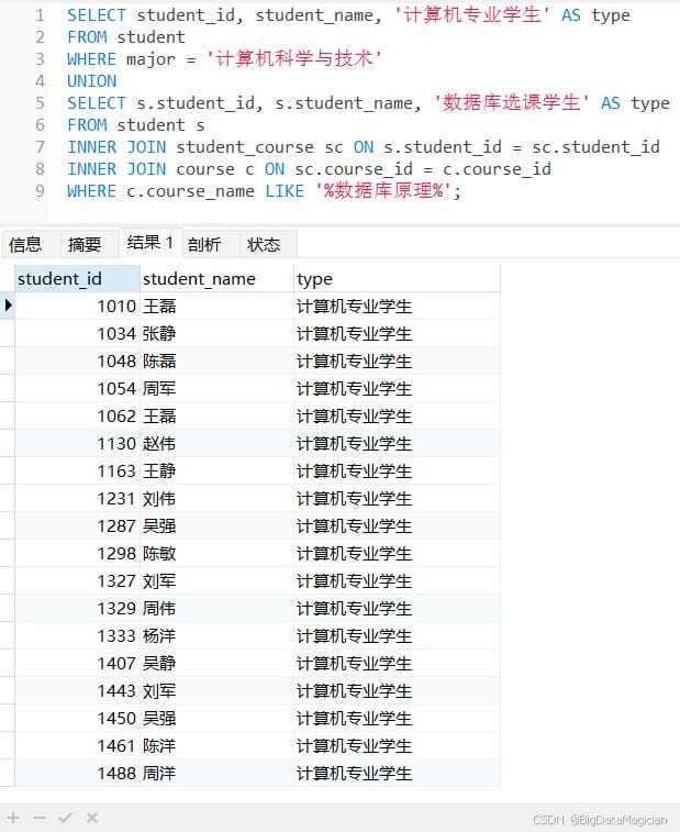select student_id, student_name, '计算机专业学生' as type from student where major = '计算机科学与技术' union select s.student_id, s.student_name, '数据库选课学生' as type from student s inner join student_course sc on s.student_id = sc.student_id inner join course c on sc.course_id = c.course_id where c.course_name like '%数据库原理%';