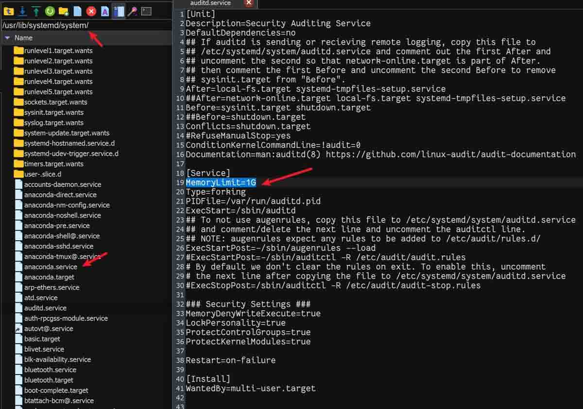 在auditd.service文件的[service]位置下面加上memorylimit=1g