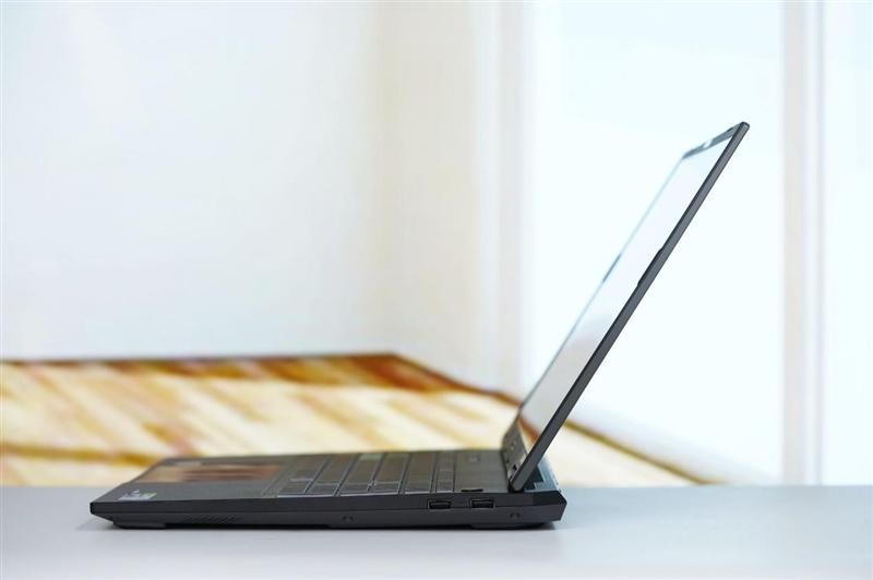 主要接口在机身左侧,从左到右依次是电源接口、rj45、hdmi、一个雷电4/usb4 40gbps、一个多功能usb-c 10gbps、一个 usb 10gbps、3.5mm耳麦合一接口。