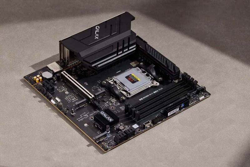 影驰联盟 b650m wi-fi 黑武士 plus 主板为纯黑配色设计,标准 m-atx 版型,pcb 为 245*245mm 的正方形,适合搭配中塔机箱。其设计风格延续了“黑武士”系列的简约硬核路线,左侧显眼的大面积散热装甲上印有 galax logo 和切割纹理装饰。