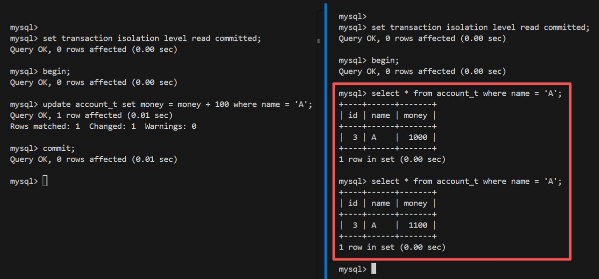 | 1 | set @@tx_isolation='read committed'; | set @@tx_isolation='read committed'; |