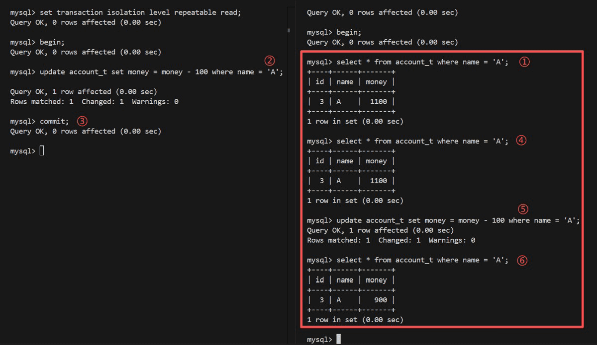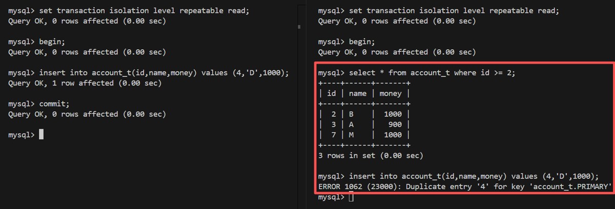 | 1 | set @@tx_isolation='repeatable read'; | set @@tx_isolation='repeatable read'; |