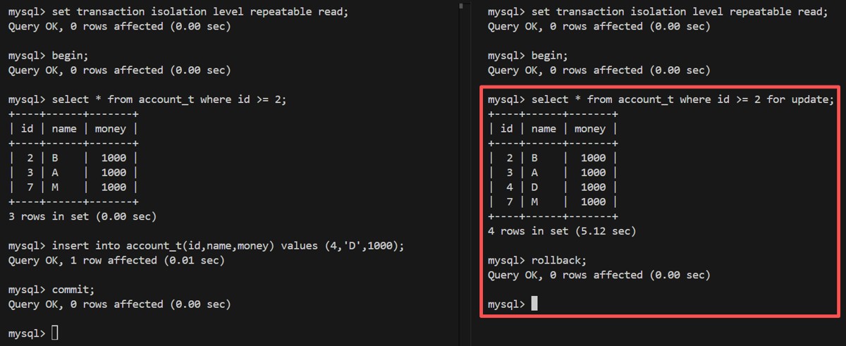 | 3 | select * from account_t where id >= 2 lock in share mode; | |