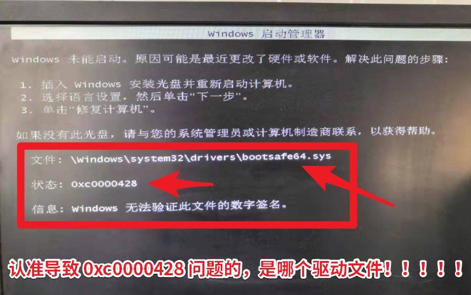 开机进不去win7系统,提示【状态:0xc0000428】和【信息:windows无法验证此文件的数字签名】,这问题怎么解决?在本文会提供三个解决方法,但无论是哪个,第一步要做的,认清楚究竟是哪个.sys驱动文件导致【状态:0xc0000428】的!