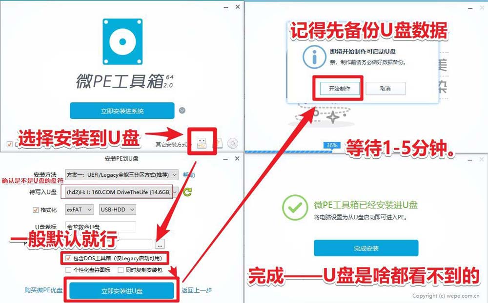 第三步,将微pe工具箱安装到u盘。注意,是安装,不是复制文件到u盘。