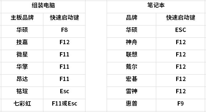 以下是常见的台式机主板和笔记本的快速启动键,但也有可能有些旧主板不支持,或者需要先在主板里打开【boot menu】功能才能支持。