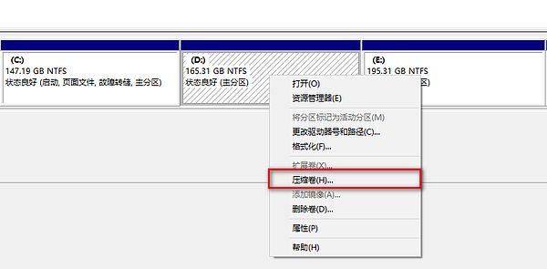 2.部分扩展:此扩展适应于 c 盘需要从 d 盘划分出部分空间。在 d 盘上点击右键“压缩卷”,然后弹出压缩窗口,压缩出新的空间用于新建 d 盘,剩余空间为 c 盘扩展空间。