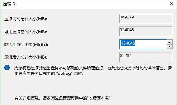 3.输入压缩的空间大小,这时候需要先把 d 盘空间清空,请提前备份数据,然后输入压缩的空间大小,也就是以后新建 d 盘的空间大小。输入空间之后点击“压缩”会在 d 盘旁边压缩出一个未分配空间。