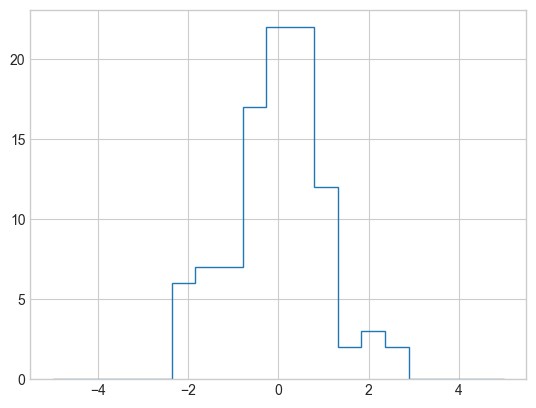# 绘制直方图 plt.plot(bins, counts, drawstyle='steps');