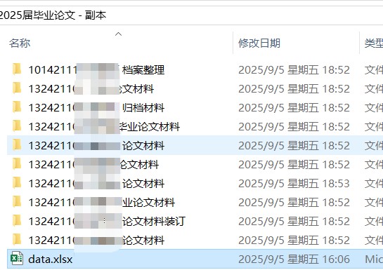 然后,我把准备好的毕业生的档案信息压缩包解压,这样可以看到每一个文件夹下面都放有一个毕业生所有的毕业论文信息,每些文件夹中都包含有学生的姓名,我们就通过关键词姓名来让程序找到目的文件夹。