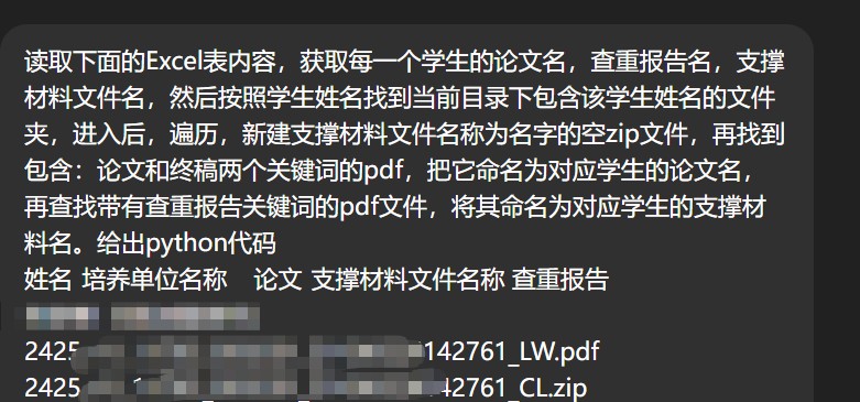 以前准备这些资料时,我都是先打开汇总表,复制文件名,然后去更改学生的毕业论文资料信息,如果只是三四个人还好说,可是今年我指导了10个人的论文,每个学生我要复制三个文件名,一个个去改,还要找到压缩包中要求的支撑材料,打包成指定文件名的zip包,一个学生平均花费我3分钟时间,10个人就是30分钟,真的是耗时费力,而且极易出错。怎么能够快速、准确地完成这项任务呢?