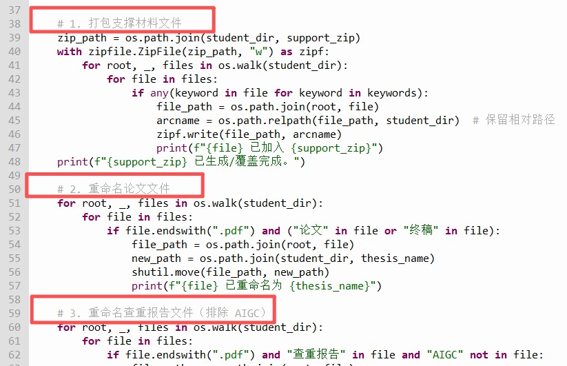 最终,我们借助ai,自定义了一个60余行python代码实现了毕业论文的全自动归档,把30分钟的工作任务压缩到3秒钟来完成,工作效率和准确度成倍提升。最终代码如下: