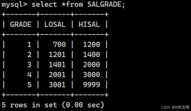 mysql> select * from emp , salgrade where emp.sal between losal and hisal;