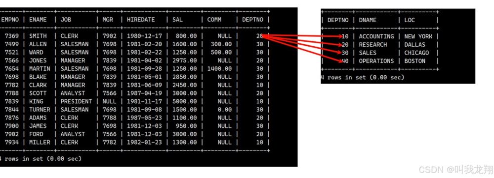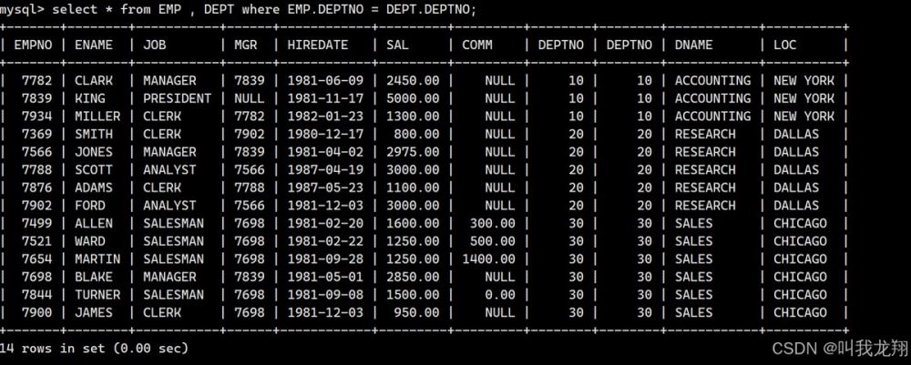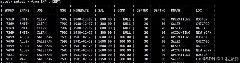这个表是由笛卡尔积得到的,emp表中的每个数据都与dept的数据进行一次匹配整合。