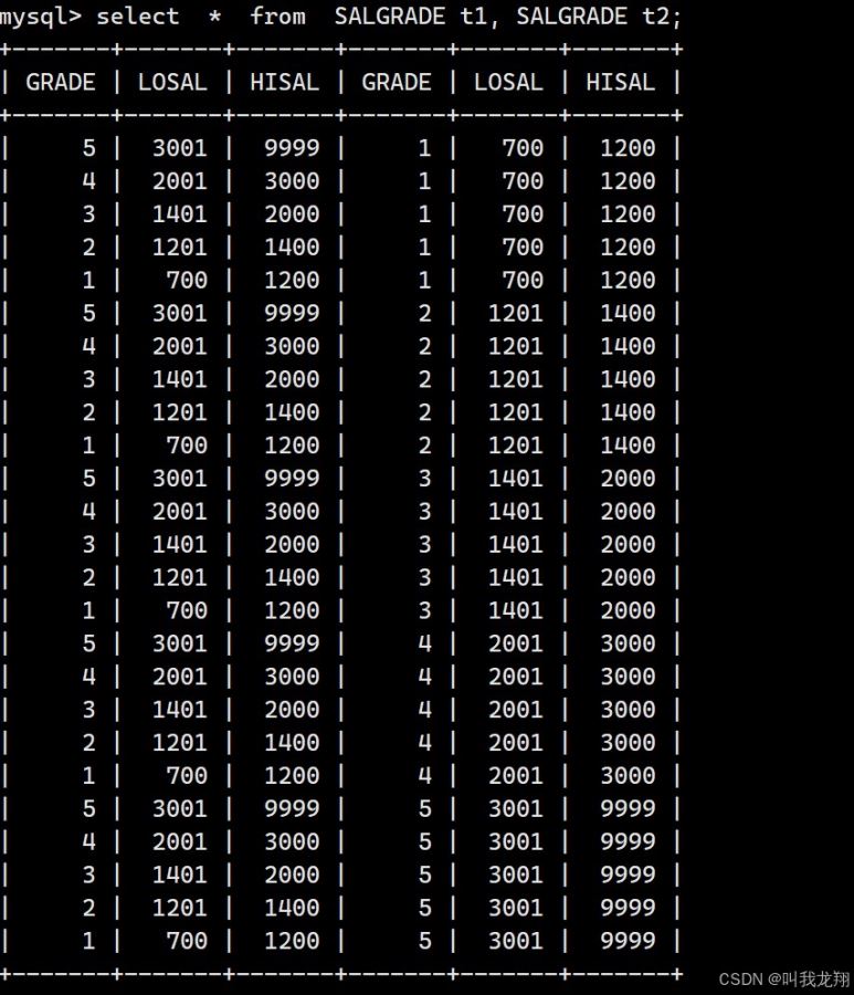 刚才我们是对两张不同的表进行笛卡尔积,然后通过大表的数据进行读取 ,那么对于同一张表也可以进行笛卡尔积!