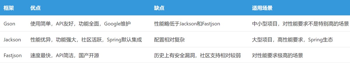 java生态中有多个优秀的json处理框架,每个框架都有其特点和适用场景。下面是三个主流框架的对比:
