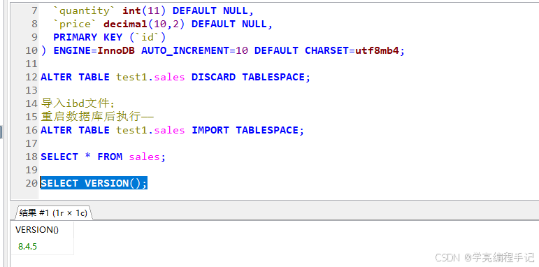 在mysql 8目标库上操作—— 1. create database test1; 2. create table test1.`sales` ( `id` int(11) not null auto_increment, `product_name` varchar(50) default null, `sale_date` date default null, `quantity` int(11) default null, `price` decimal(10,2) default null, primary key (`id`) ) engine=innodb auto_increment=10 default charset=utf8mb4; 3. alter table test1.sales discard tablespace; 4. 导入mysql5.7.44中sales表的ibd文件至对应的数据目录下; 5. 重启数据库后执行下述导入表空间操作; 6. alter table test1.sales import tablespace; select * from sales; select version();