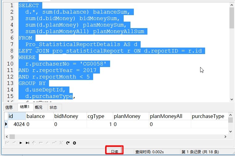 - 4.我自己遇到的一种,使用了group by来查询的结果,因为使用了group by,查询出来的数据不是原来表里的数据了,有的是一个种类的数据之后,所以不能修改,出现只读