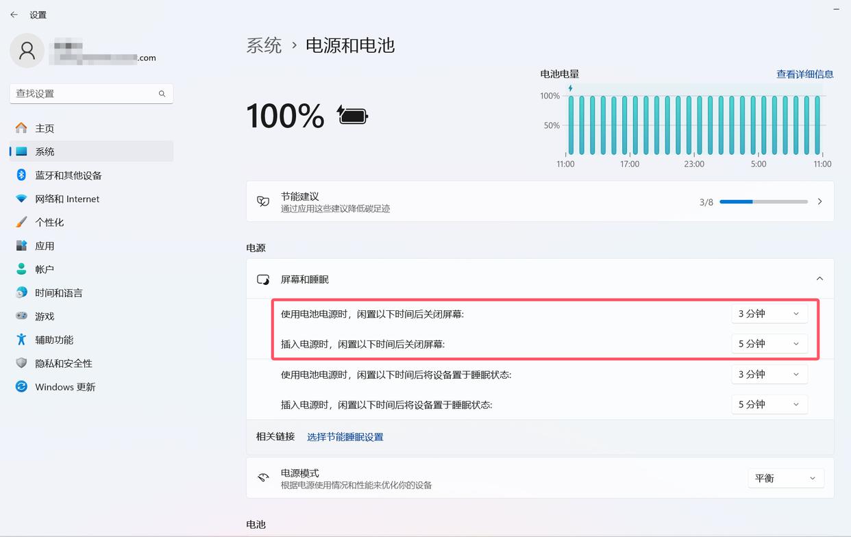 在【屏幕和睡眠】栏,根据需要设置使用不同电源时,闲置多长时间后关闭屏幕。