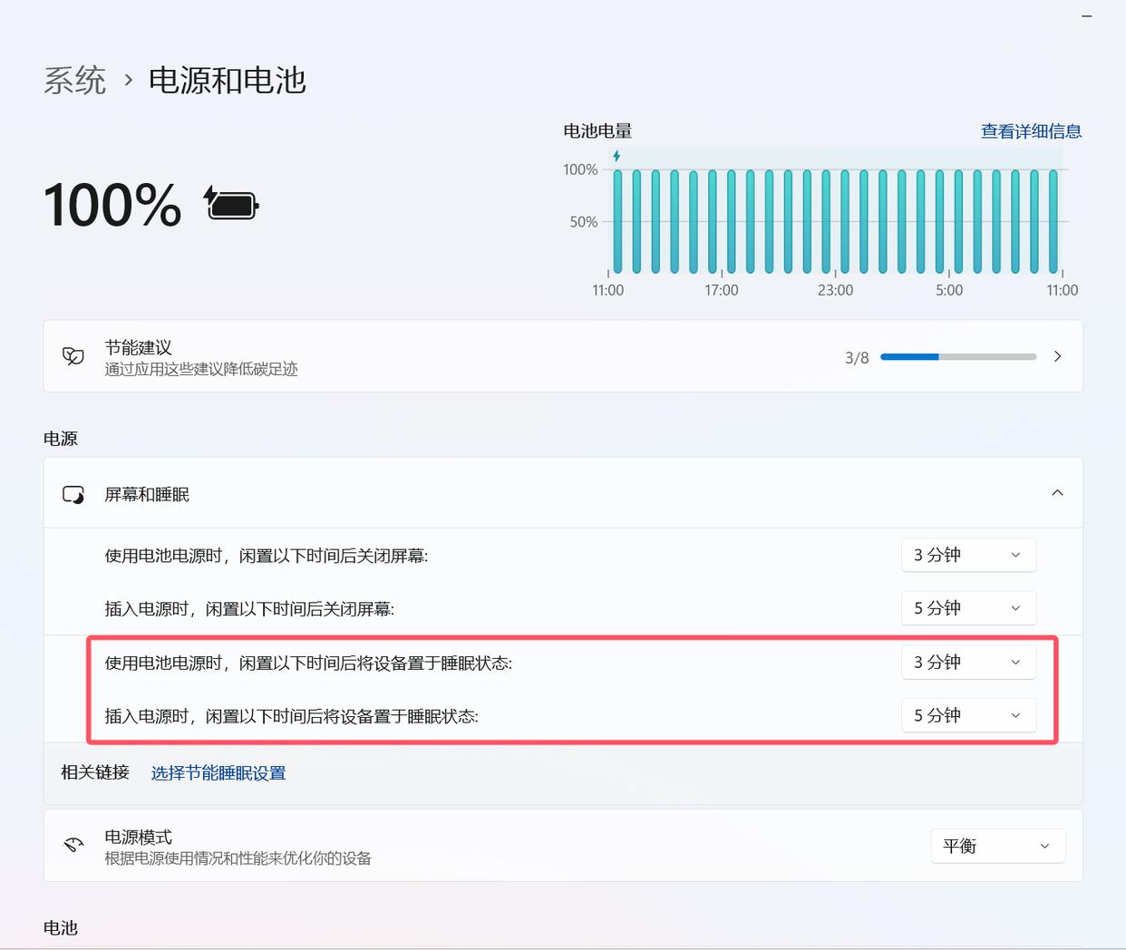 在【屏幕和睡眠】栏中还有【闲置以下时间后将设备置于睡眠状态】的选项,那关闭屏幕和置于睡眠状态有什么区别呢?