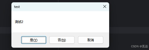 # win32con.idok: 用户点击了“确定”按钮。 # win32con.idcancel: 用户点击了“取消”按钮。 # win32con.idyes: 用户点击了“是”按钮。 # win32con.idno: 用户点击了“否”按钮。 mes = win32api.messagebox(none, "测试2", "test", idok | idcancel) print(mes)