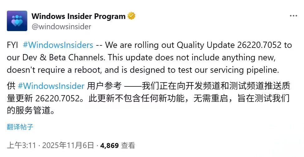 微软 windows insider 官方 x 账号今天(11 月 6 日)发布推文,邀请 dev 和 beta 频道的项目成员,测试 windows 11 build 26220.7052 预览版,最大特点是安装过程无需重启系统,实现了“零中断”更新体验。