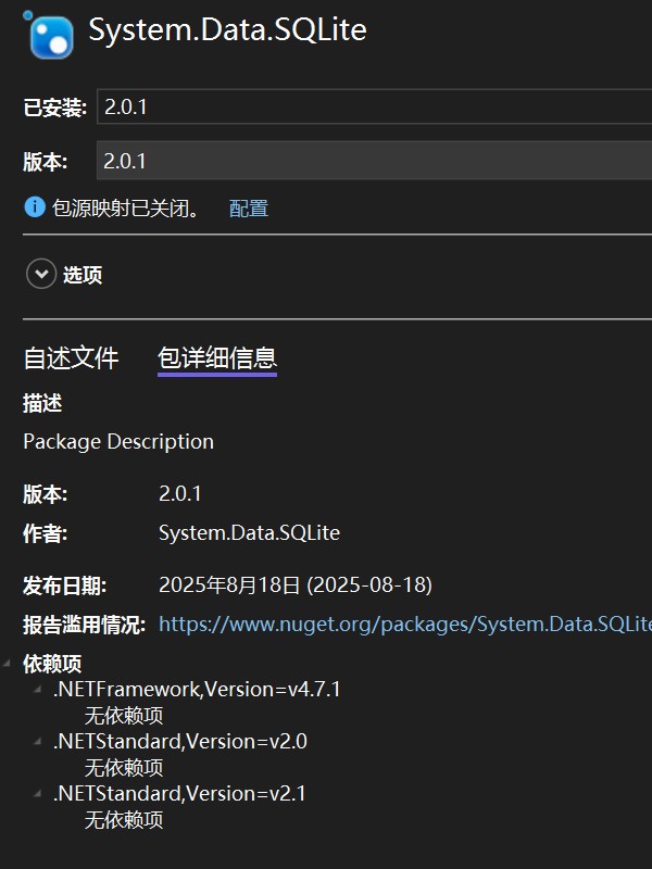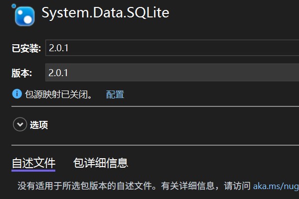 百度查了半天,啥都没有,我也是醉了,问ai也没问出个答案,回答全是乱七八糟的,于是我又查看了 system.data.sqlite 的自述文件和包详细信息,是这样: