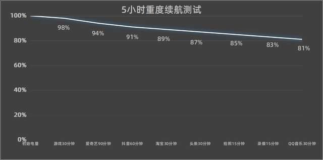 经过中关村在线五小时重度续航测试,iqooneo11还能剩余81%的电量,就算周末假期猛猛上分也不用担心电量问题。