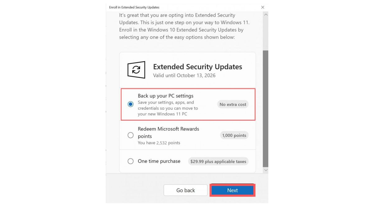 如果用户不想要备份 windows pc 设置,可以使用 microsoft 账户中的 1000 rewards 积分注册 windows 10 esu。