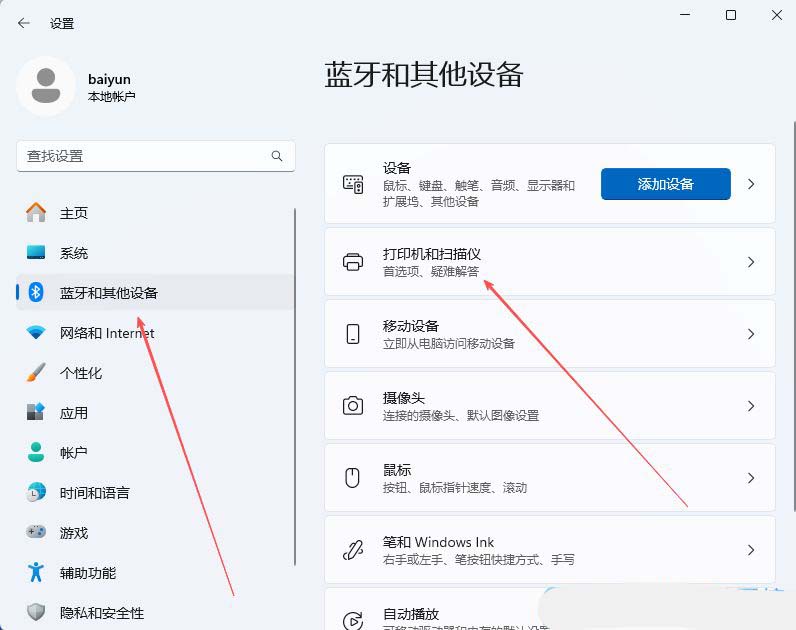 2、接着,在打开的界面中,点击左侧的“蓝牙和其他设备”,再选择“打印机和扫描仪”。