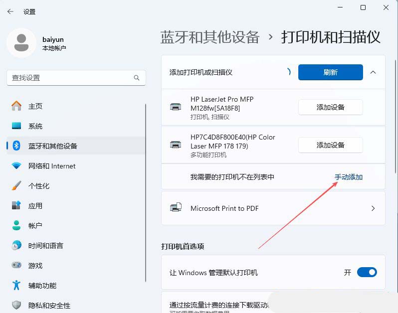 4、随后,若没有扫描到打印机,可选择点击“手动添加”。