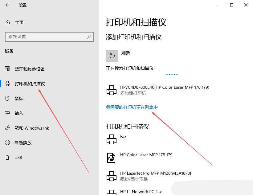 2、接着,在打开的界面中,点击左侧“打印机和扫描仪”设置,选择“我需要的打印机不在列表中”。