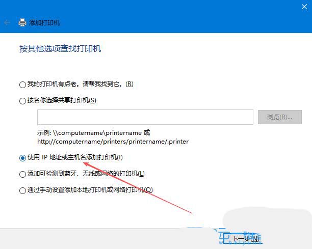3、此时,在弹出的向导中,选择“使用ip地址或主机名添加打印机”。