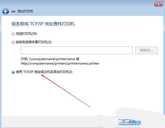6、选择“使用tcp/ip地址或主机名添加打印机”,点击下一步。